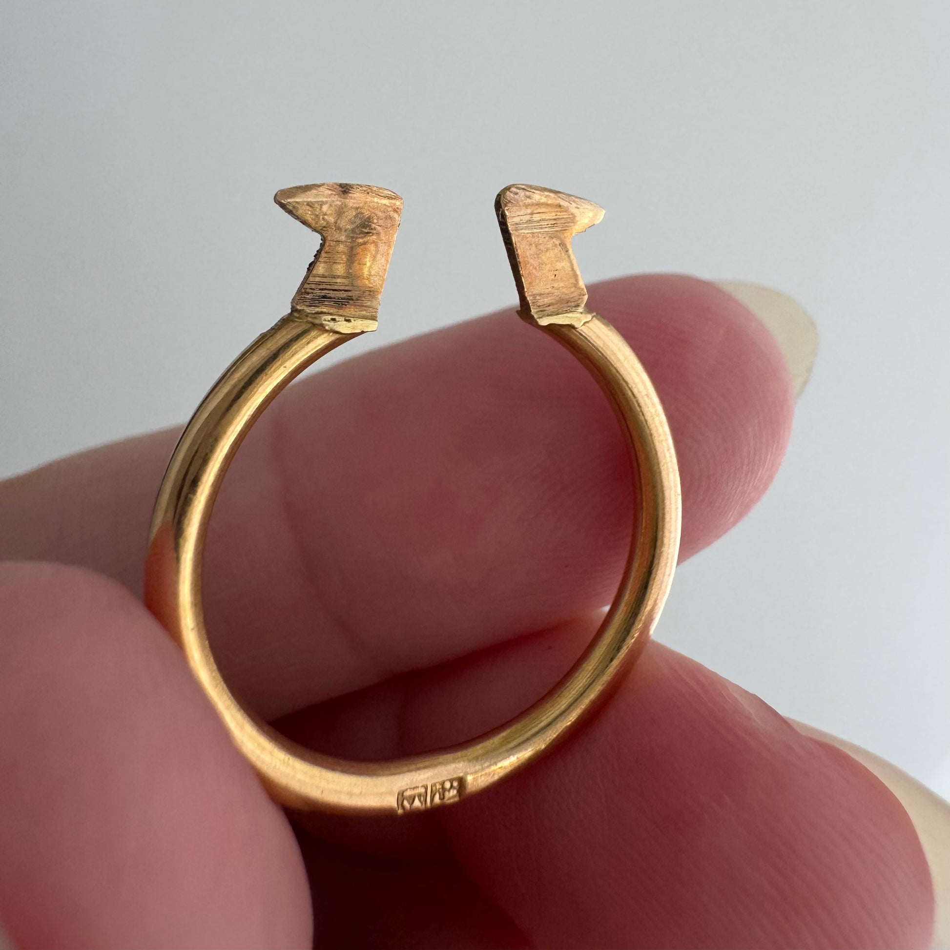 the pointy ends of the ring that protrude out of the triangular cap are a bit sharp/pointy — these could be buffed down by a jeweler if you wanna