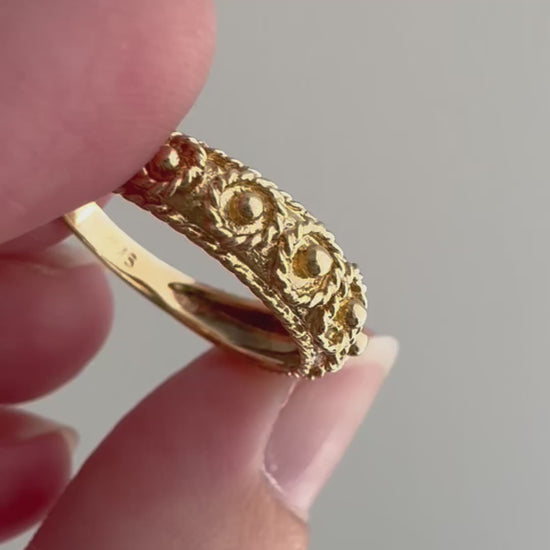 it's a revival of a revival — 1970s in the style of a victorian era take on an etruscan era design. it's a dome and a tapered band and floral and stackable and a really wonderful example of rope detailing