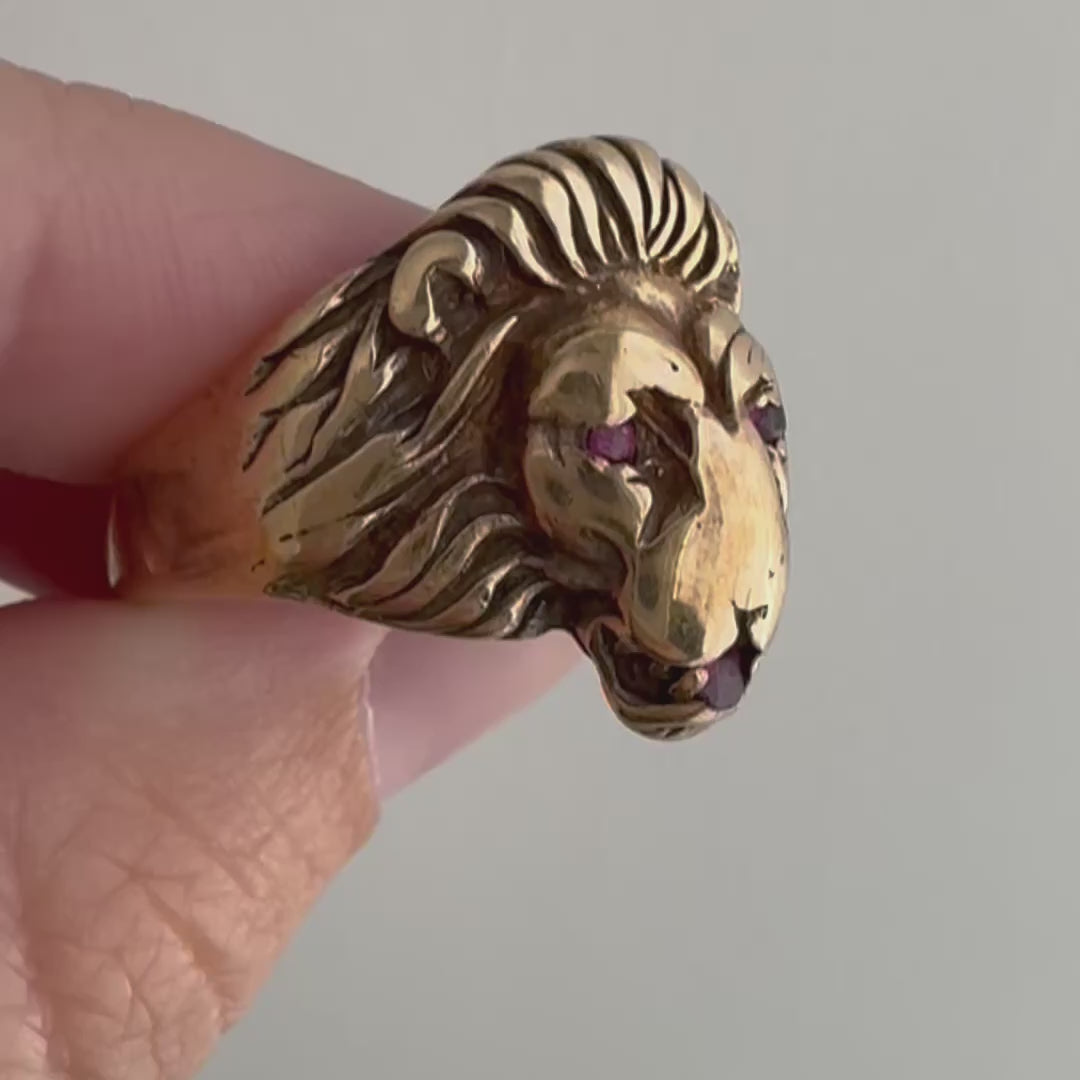 a very, very wonderful classic lion ring with ruby accents. this is a nice, older (circa 1970s) example of a lion ring with the time-earned wear patterns that ofter a softness to the features of the lion
