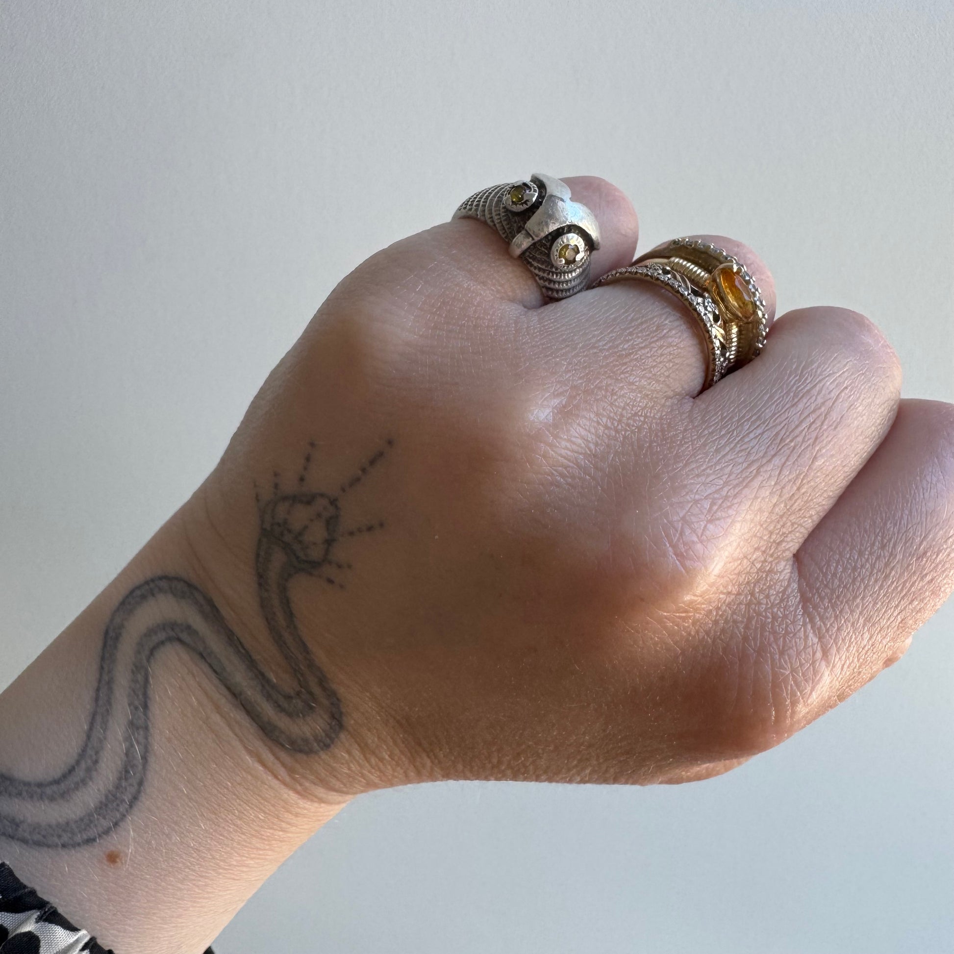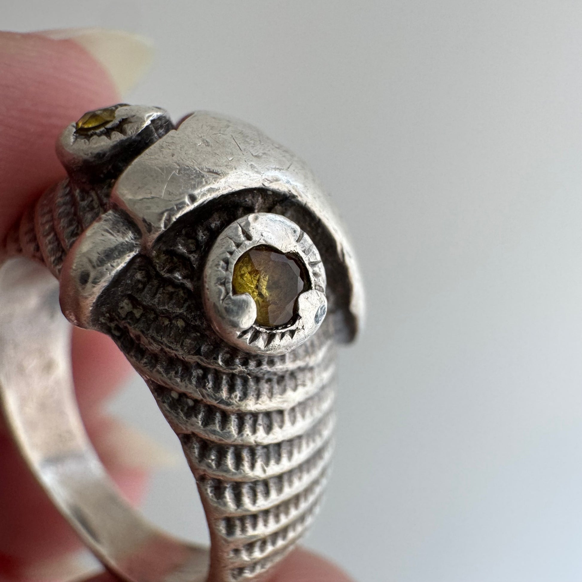unmarked solid sterling silver with yellow stone eyes — either citrine or topaz