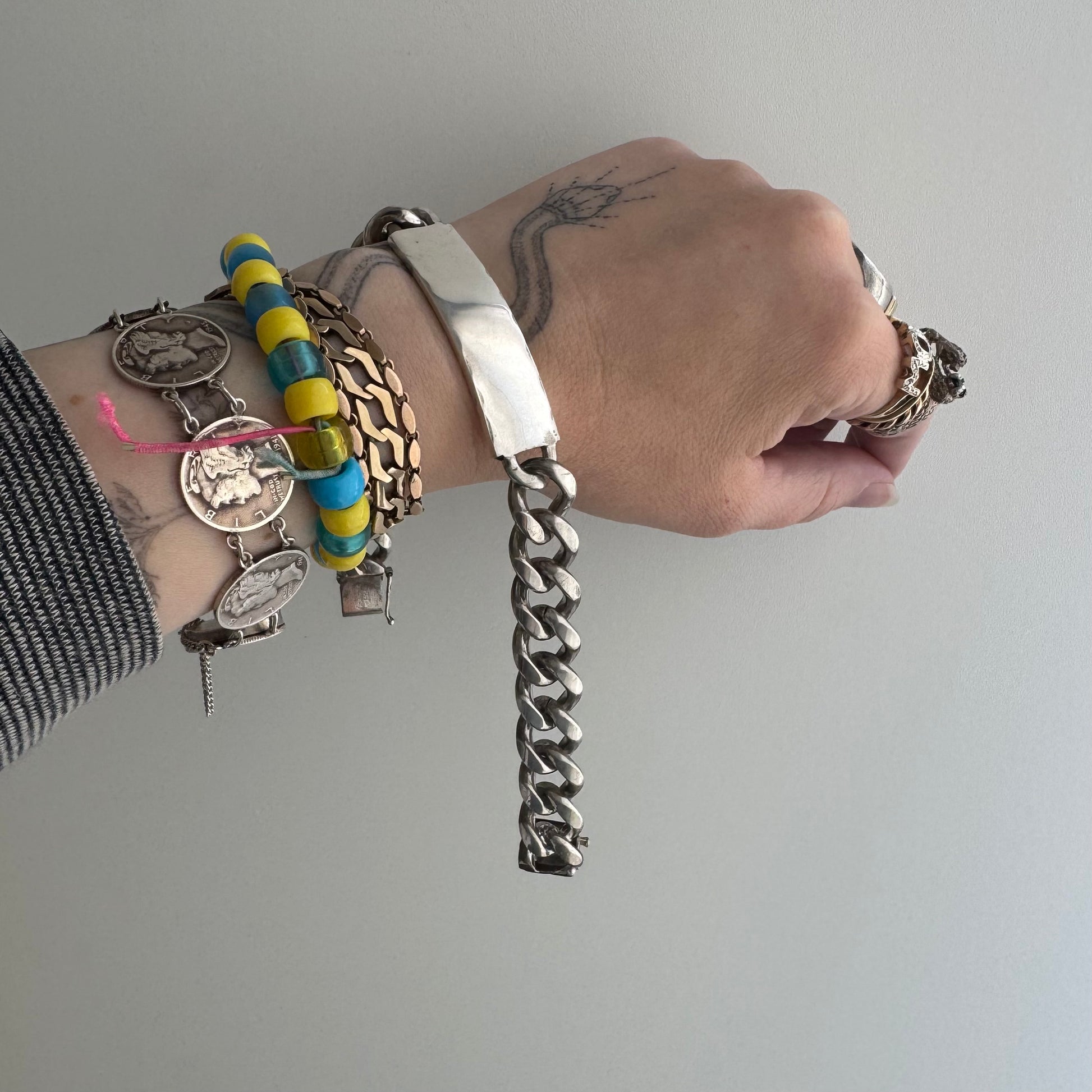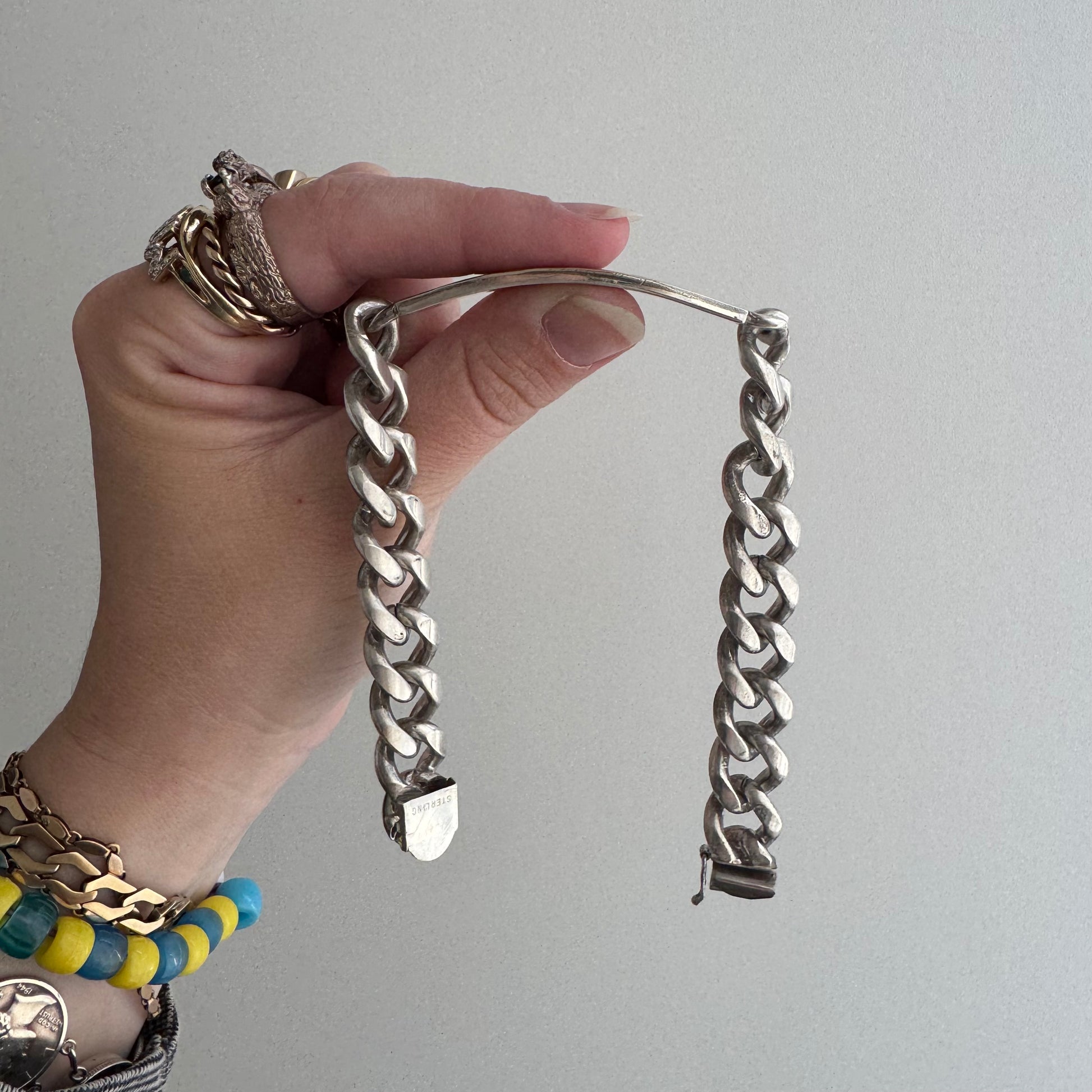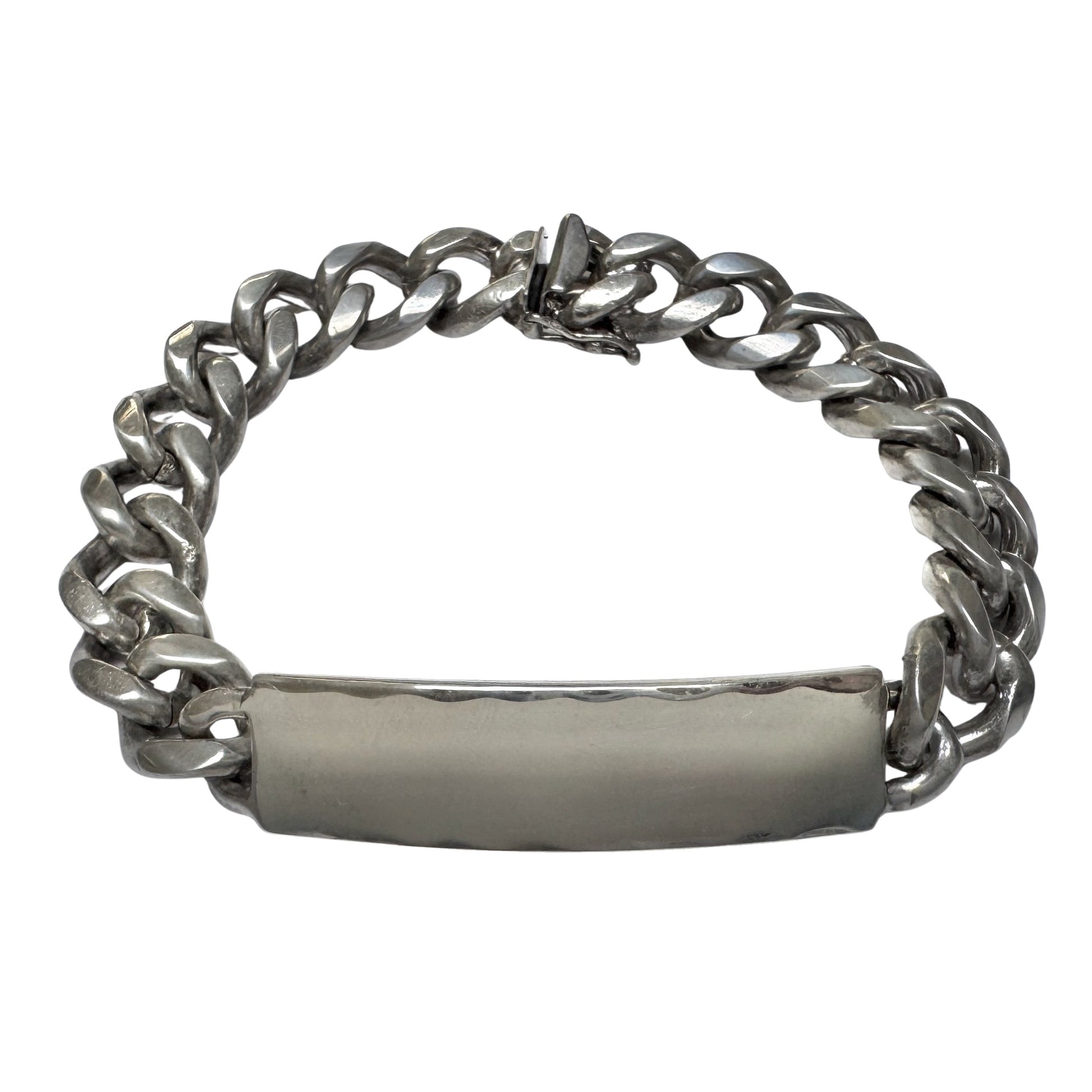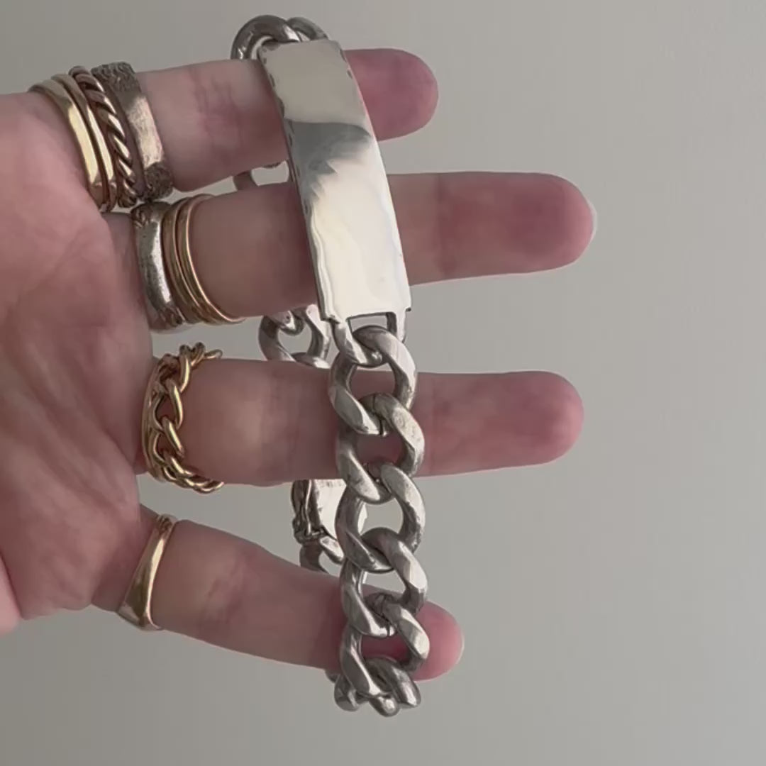 some designs are truly timeless and this is one of them. a sturdy, classic, sterling silver ID bracelet with curved, rectangular panel and timeless curb chain. it once had engraving, but that's been mostly buffed away by a jeweler. the curb links are slinky, chunky perfection and the ID panel is nice and thick — do you see the subtle scalloped details on the sides? they really don't make them like they used to