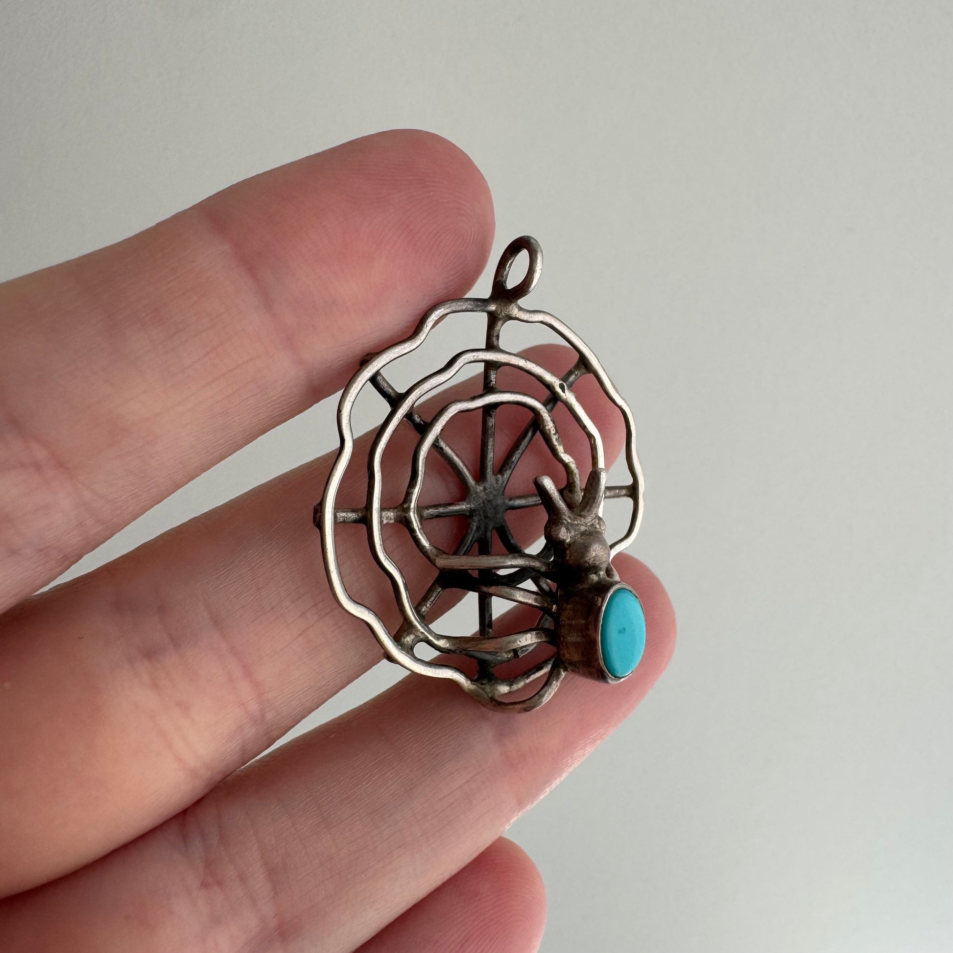 V I N T A G E // web weaver / sterling silver turquoise back spider on her web / a pendant